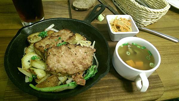 巴伐利亞香煎肉排佐培根時蔬炒薯片、小菜、湯